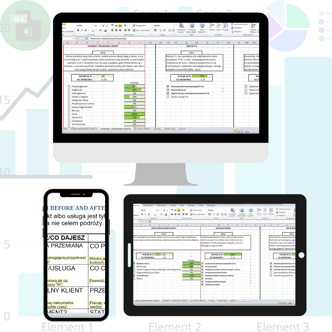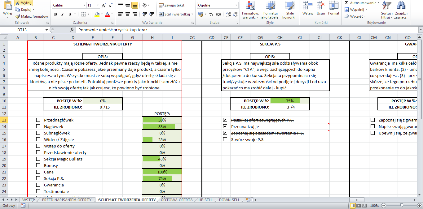 Schemat oferty sprzedązowej jaki Ci oferuje to jedyny taki w Polsce system, który idealnie nadaje się w procesie pisana porywającej oferty sprzedażowej. Dzięki niemu zobaczysz co masz jeszcze do zawarcia w ofercie, a co już zrealizowałeś.