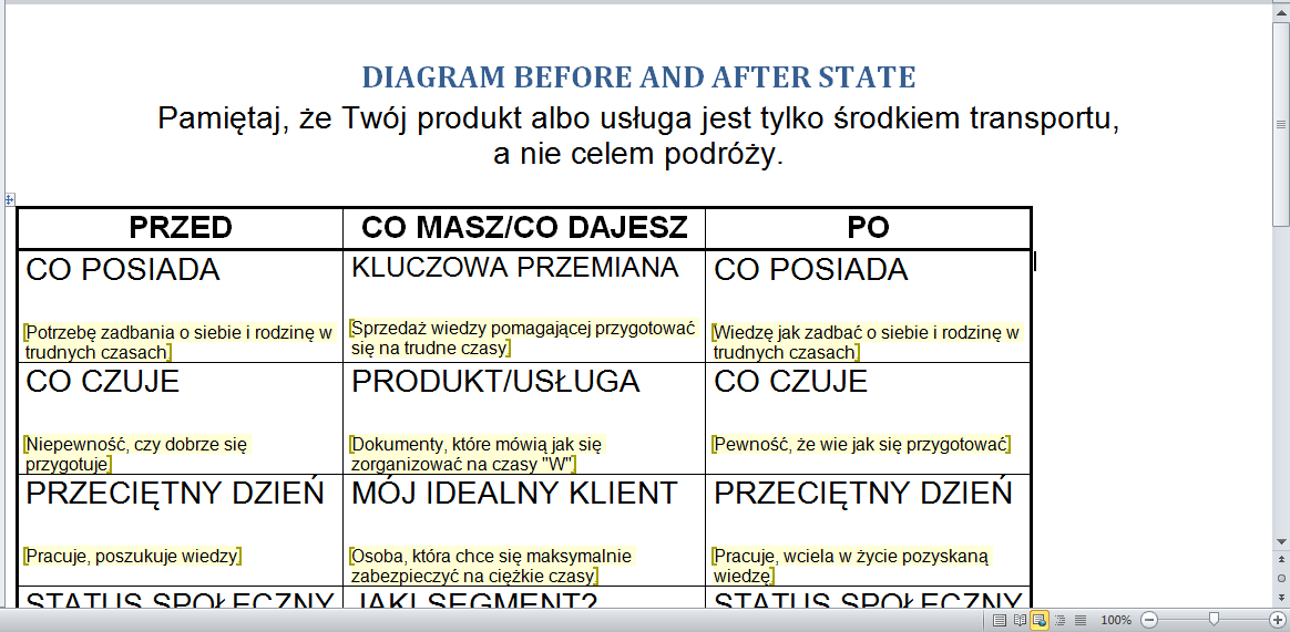 Pomoże Ci on precyzynie określić kim jest Twój klient i jaką transformacje mu zapewniasz. Dowiesz się dzięki niemu kim był przez zakupem Twego produktu i kim się stanie po jego zakupie, co znacznie ułatwia tworzenie dobrej oferty.