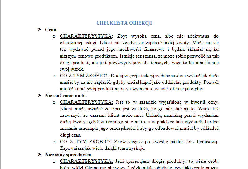 Bardzo przydatna lista pomagająca zobrazować obiekcje klienta przed zakupem Twojego produktu. Na 9 stronach A4 dowiesz się o wielu możliwych obiekcjach i co z tym zrobić, aby już w samej ofercie zostało to rozbite, albo też poprzez inne działania.