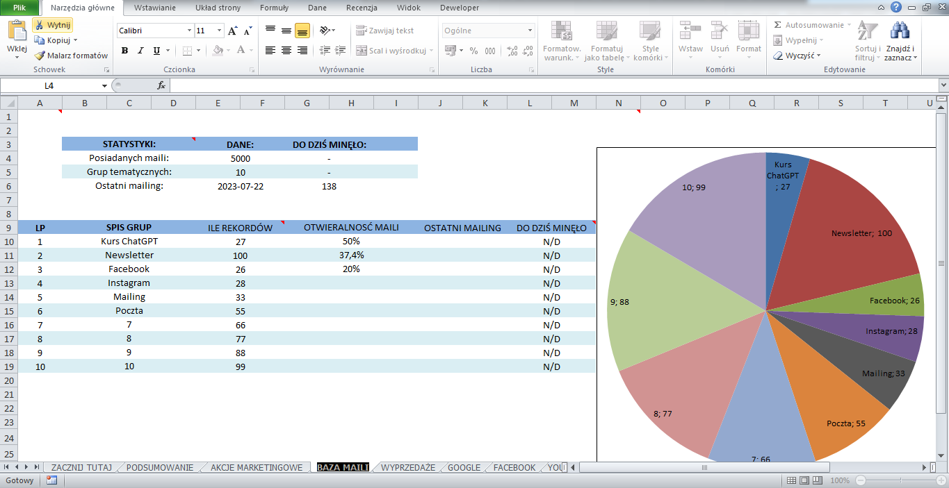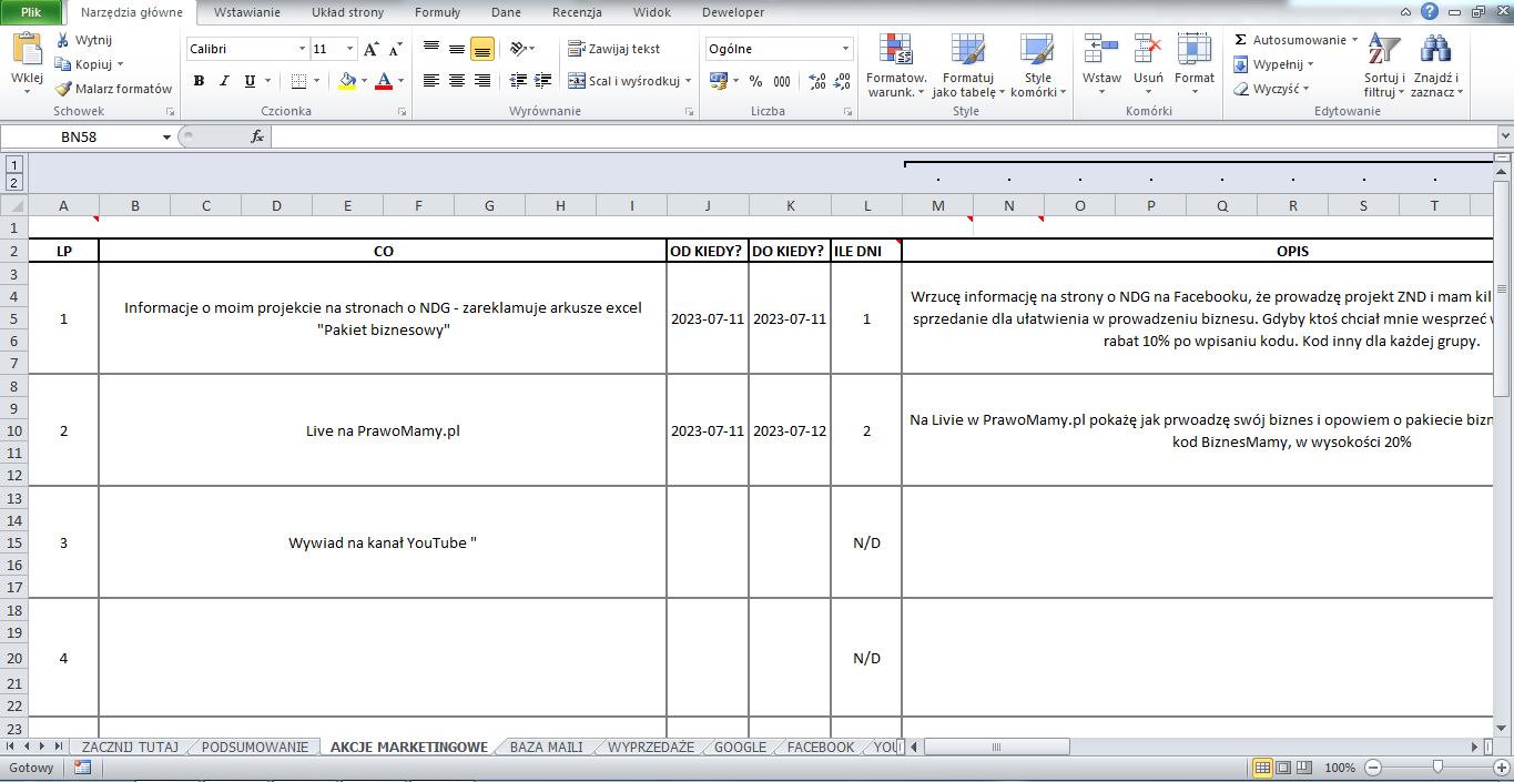 Dzięki temu dokumentowi zyskasz elastyczne narzędzie do planowania i zarządzania swoimi kampaniami marketingowymi. W wygodny sposób zarządzaj swoją bazą mailową orazy wysłanymi mailami jak i kampaniami na róznych portalach społecznościowych, czy też w wyszukiwarkach.