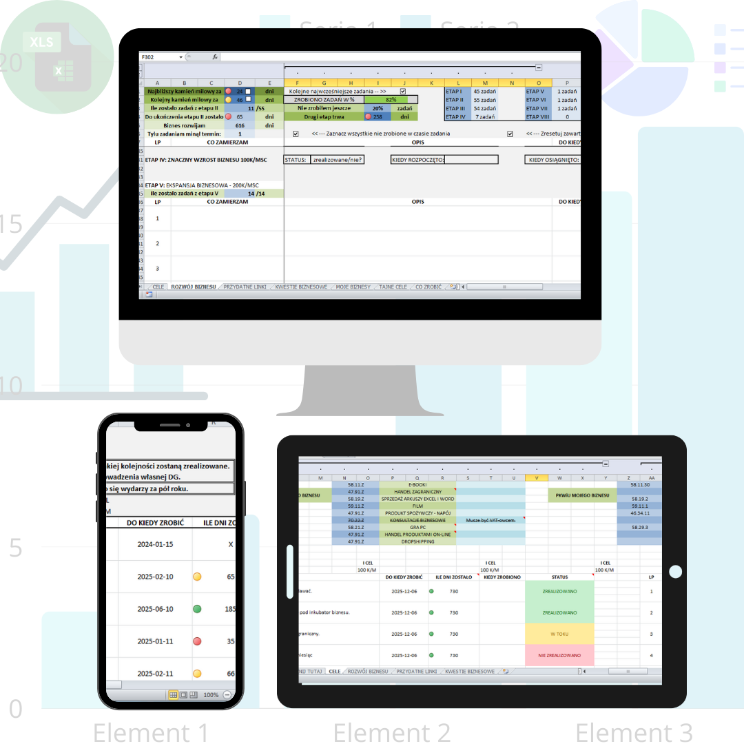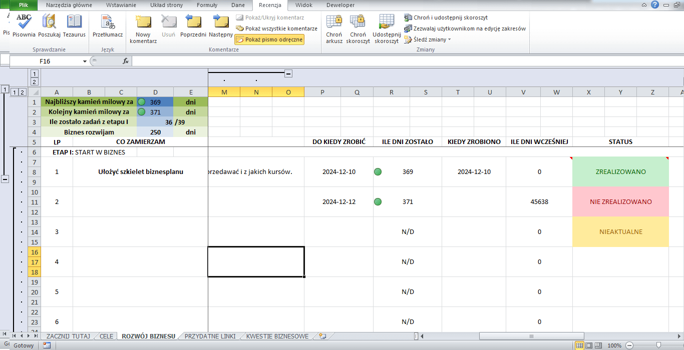 Ustalenie swojego biznesplanu pomaga skupić się na tym co najważniejsze. Pozwala skierować Twoją uwagę w miejsce, które wymaga aktualnie uwagi. Dlatego też po zakupie tego arkusza, dostaniesz dostęp do dokumentu, który pomoże Ci się zorganizować, ustalić cele, wybrać daty i przestrzegać ich. System automatycznie będzie obliczał ile dni zostało do zrealziowania danego celu, motywując Cię do działania!