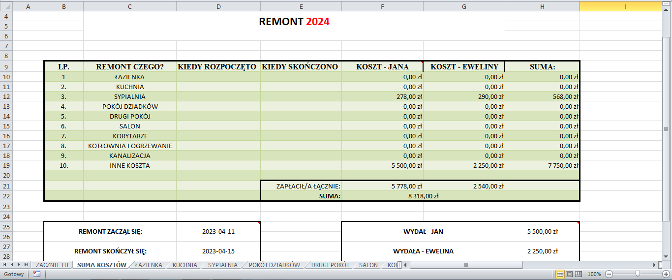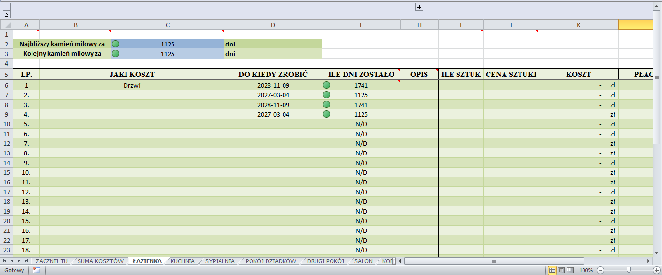Dokument automatycznie podliczy koszta i wyliczy do kiedy jakie rzeczy chcesz zrobić, a nastepnie będzie pilnował zbliżających się terminów, abyś miał pewność, że wszystko zostanie dopięte na ostatni guzik w czasie.
